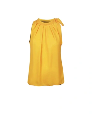A sleeveless design with gathers around the neckline, featuring a neck collar with a bow, regular fit, and in freesia color. It can be paired with various outfits from the collection