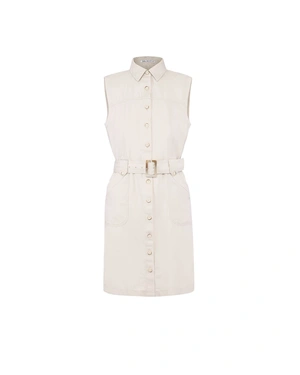 Model without sleeves, with a collar and buttons along the dress, with a textile belt and length above the knee, the effect of the fabric is achieved with garment wash technology, which gives a unique look to each piece, it can be combined with a jacket from the collection.