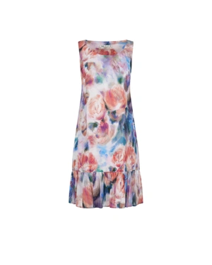 Elegant dress with a round neckline, sleeveless, featuring a ruffle at the bottom, made of fine chiffon from viscose and rayon, with a viscose lining and knee-length.