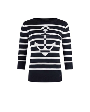 Elegant sweater model, fine knit with a high percentage of viscose in the composition, with 7/8 sleeves, round neckline, and regular fit, contrasting stripes, and a front anchor motif.
