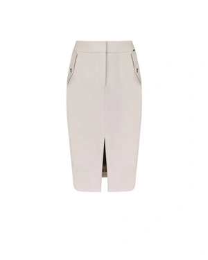 A pencil skirt with two side pockets with flaps, a front slit, and a knee-length with acetate lining. The skirt features a finely textured fabric and can be paired with a blazer from the collection.