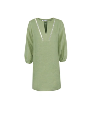 Long sleeve, V-neck and above-the-knee length dress made from 100% hemp with viscose lining, model is 170cm and wears a size 36.