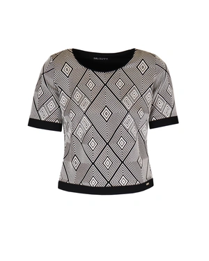 Blouse with short sleeves, round neckline, and contrasting trim, with regular fit. Made from jacquard fabric containing rayon and slight elasticity, it can be paired with a matching skirt from the collection. The model is 176 cm tall and wears size 36.