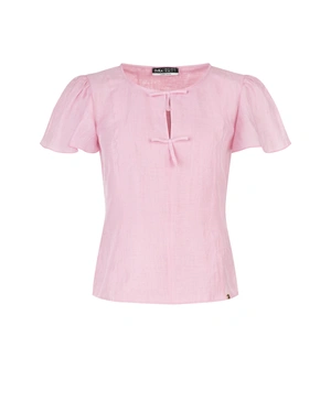 Summer blouse in light pink, with short sleeves, regular fit emphasized by seams, and decorative bows at the front. The fabric contains a high percentage of linen.