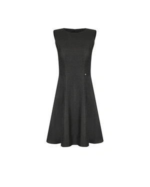 Classic dress with a round neckline, sleeveless, accentuated waist, and flared bottom, knee-length. The fabric is a blend of linen, rayon, viscose, and metallic lurex threads. The model has a viscose lining and can be paired with the matching blazer from the collection.