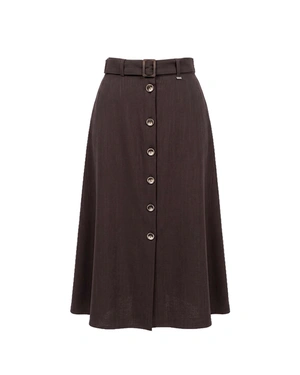 Elegant midi skirt with vertical buttons made of viscose and linen, featuring a textile belt and an A-line silhouette; the classic chocolate brown color makes it a suitable choice for the office.