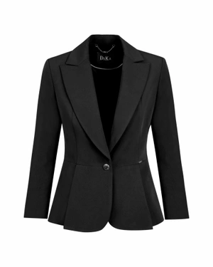 A fitted jacket with a deep neckline, lapels, and a single-breasted fastening, featuring a peplum. It can be paired with a matching pair of trousers from the collection.