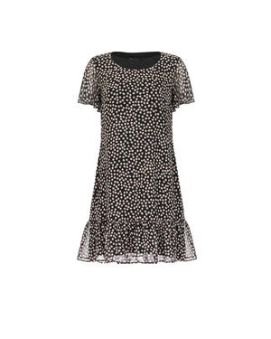 Mousseline dress with contrasting polka dot print, round neckline, short sleeves, and regular fit, featuring a ruffle at the bottom. The model has a viscose lining.