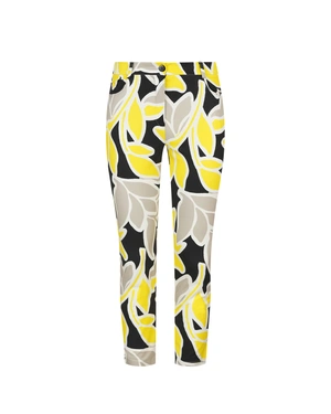 Casual summer trousers with a tapered leg, featuring a contrasting yellow-grey leaf pattern on a black background. The fabric is a blend of cotton and viscose with slight elasticity.