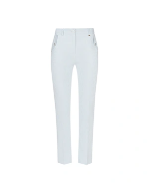 Fine striped trousers with a tapered leg, crease, and flap pockets. The fabric is cotton and viscose.