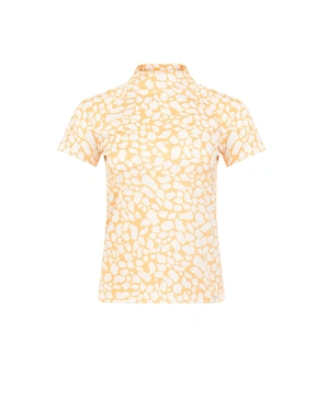 A finely knitted jersey blouse with short sleeves, a regular fit, and an abstract print. The fabric has elasticity.