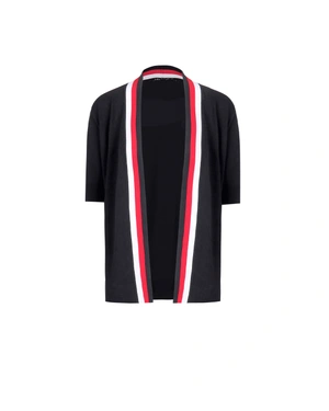 An elegant casual cardigan with 3/4 sleeves and an open front, featuring contrast two-tone piping. It is perfect for the transitional season and can be paired with a matching skirt or casual pants.