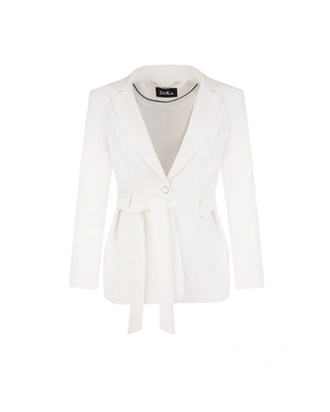 Stylish wrap jacket with a fabric belt at the waist, featuring lapels. The fabric is crepe with a slight transparency and is lined. It can be combined with the corresponding trousers from the collection. The model is 176 cm tall and wears size 36.