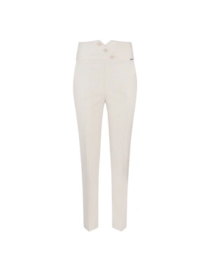 Model cu talie înaltă, închidere asimetrică cu nasturi, croială conică pe picior, material din bumbac și viscoză, poate fi combinat cu o jachetă din colecție.