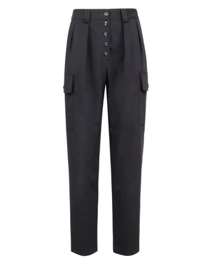 Model cu picior conic, nasturi in fata, doua buzunare laterale cu clape cu nasturi, cu bride pentru centura in talie, poate fi combinat cu un tricou din colectie. Romina are 1,74 m inaltime si poarta marimea 36.