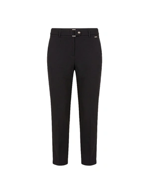 Pantaloni negri de zi cu zi, cu o croială conică pe picior și o curea textilă pentru a accentua talia, materialul conține bumbac.