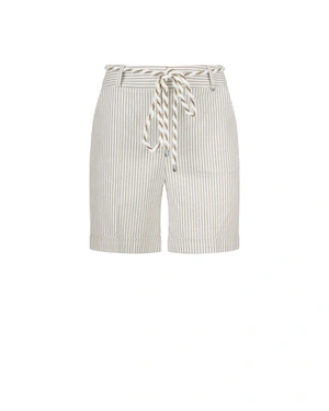 Pantaloni scurți în dungi fine, din bumbac și viscoză, cu nasturi și curea textilă tip frânghie. Lungimea lor este de la jumătatea coapsei și poate fi combinată cu o jachetă din colecție.