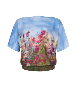 Model tricotat elegant, cu decolteu rotund, talie definită și mâneci scurte tip liliac, cu imprimeu arhitectural tematic