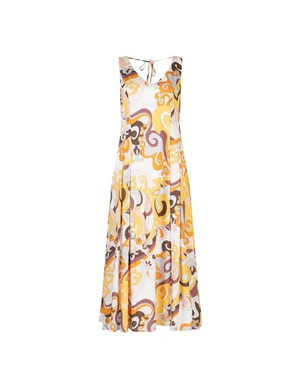 Model cu decolteu in V, fara maneci, top mulat si evazata, lungime la glezna, materialul este 100% vascoza.