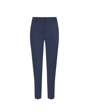 Elegantne tamnoplave pantalone sa trajnim naborom, suženim nogavicama, italijanskim džepovima i omčama za kaiš u struku; materijal ima vertikalne niti sa isprepletenim minijaturnim šljokicama; pogodne za svečane prilike i mogu se upariti sa blejzerom iz kolekcije.